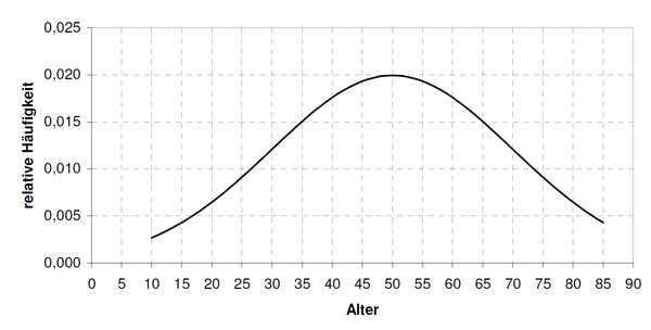 Stehen keine Daten zur Verfügung, soll die folgende Standardpopulation verwendet werden. Sie besteht zu jeweils 50 % aus Männern und Frauen deren Alter wie in Abbildung 1 dargestellt zwischen dem Minimum- und Maximumwert normalverteilt ist. Der Mittelwert des Alters ist 50 Jahre, die Standardabweichung 20 Jahre. Das Minimumalter beträgt 10 Jahre, das Maximumalter 85 Jahre.
