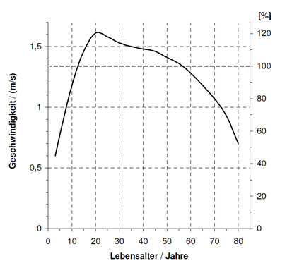 Zur durchschnittlichen Gehgeschwindigkeiten für eine stadttypische Bevölkerung in Abhängigkeit vom Alter gibt es verschiedene Veröffentlichungen. Es empfiehlt sich, die Werte entsprechend der Veröffentlichungen von Weidmann [2] zu verwenden.