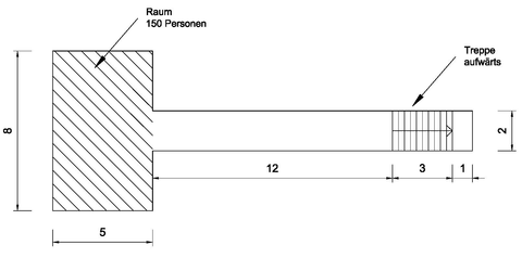 Konstruiere einen Raum, der durch einen Gang mit einer Treppe verbunden ist (vgl. Abbildung 10) besetzt wie gezeigt mit einer Population von erwachsenen Personen aus Tabelle 1 mit sofortiger Reaktion und verteile die Gehgeschwindigkeiten auf eine Population von 150 Personen. Das erwartete Ergebnis ist, dass ein Stau am Ausgang des Raumes auftritt, der einen stetigen Fluss im Gang erzeugt. Zusätzlich wird ein Stau am Fuß der Treppe erwartet, der mit der Zeit wachsen sollte, da der Fluss über die Treppe kleiner ist, als der durch den Gang.